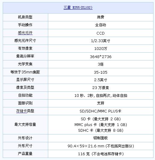 三星ES55是一款拥有千万像素成像能力,3倍光学变焦性能的入门级数码相机产品。虽然和目前市场上主流配置有些差距,但对于一般的拍摄需求还是可以轻松胜任的。