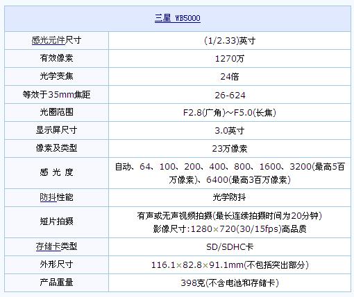 三星WB5000。它的镜头方面采用了24倍光学变焦系统,最大广角端为26mm。总像素达到了1250万,同时支持还支持拍摄RAW非压缩格式的照片文件。它支持全手动调节模式,同时包含了众多家用机中也附带的面部识别技术和高清视频的摄录功能。