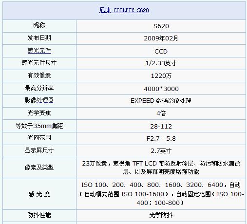 尼康S620这款机型拥有1200万有效像素,配备了等效焦距为28-112mm的4倍光学变焦尼克尔防抖镜头,使用了2.7英寸23万像素液晶显示屏,并具备超快的0.7秒快速启动功能,以及两厘米的微距拍摄性能。