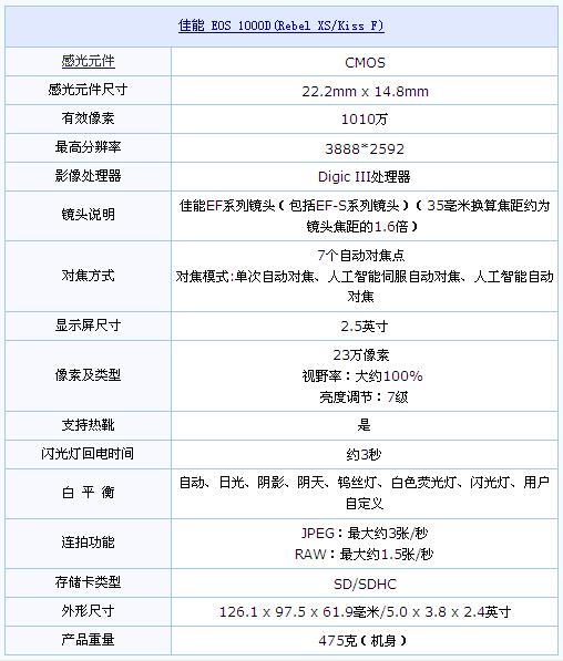 佳能EOS 1000D采用了一块APS-C尺寸的CMOS传感器,有效像素为1000万。同时佳能1000D搭载了7点宽区域自动对焦系统,以及每秒3张的无限高速连拍模式。而在RAW模式下则可实现1.5张每秒的连拍速度。