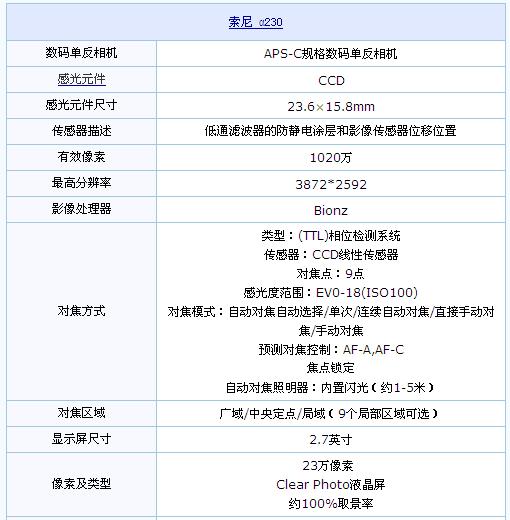索尼a230采用了尺寸为23.6×15.8mm(APS-C画幅)的CCD影像传感器,高达1020万有效像素,配合强大的Bionz影像处理器,重现更自然生动的画面色彩。