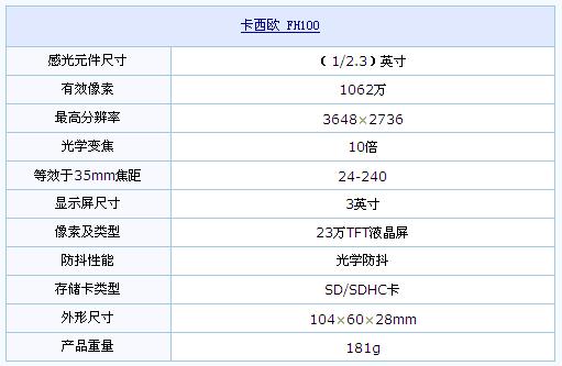 卡西欧FH100拥有一千万像素的成像能力,使用性能更好的新型CMOS图像感应器。使用等效焦距为24-240mm的十倍光学变焦镜头,并使用传感器位移防抖技术。感光度最高可达ISO3200,并拥有全手动曝光功能,使用3英寸23万像素液晶屏。
