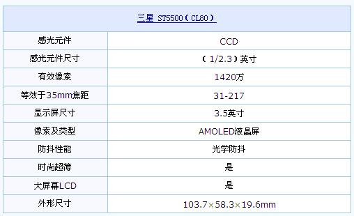 三星ST5500使用1/2.3英寸1420万有效像素CCD,以及7倍光学变焦防抖镜头。并支持720P素质的高清摄像功能,并拥有HDMI高清数字接口。与三星ST1000一样,ST5500也内建有蓝牙2.0和WI-FI无线技术,使用者可以用它接收邮件,也可以直接将所拍摄的照片共享到图片类的网站。而向人脸识别、智能场景选择等主流配置,也都可以在两款三星相机身上找到。