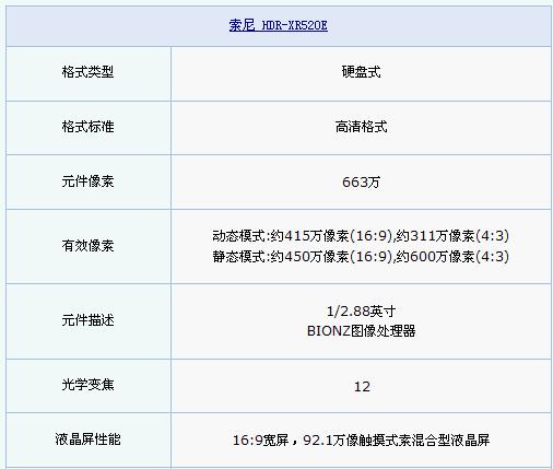 索尼新一代旗舰级民用摄像机XR520E,采用总像素为663万的“Exmor R” CMOS影像传感器。使用专业的“G镜头”具备12倍光学变焦性能并配备光学防抖功能,作为旗舰级产品,XR520E具有海量存储空间,240GB的容量可以满足长时间拍摄的需要。