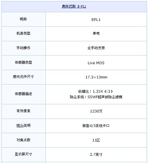 E-PL1是奥林巴斯PEN系列的最新款机型。该机拥有1230万有效像素,最大可拍摄4032×3024像素的图片,画质堪比单反,机身带感光器位移防抖系统和防尘系统。与奥巴PEN系列前作相比,该机采用塑料机身,售价相对低廉,是单电用户的高性价之选。