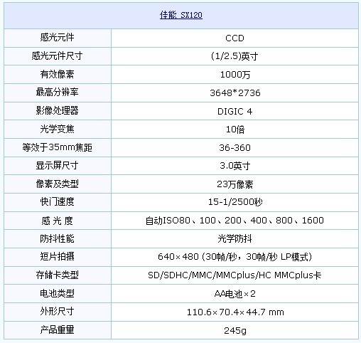 佳能SX120是一款定位于便携长焦领域的产品,在主流性能配置的同时,在体积上也控制的很好。而在画质方面,DIGIC4图像处理器提供了良好的支持。而1800元的价格也是比较合理的,推荐给家庭用户以及摄影初学者使用。