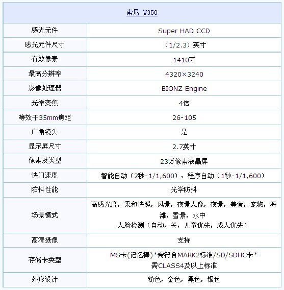 索尼W350拥有1400万像素的成像能力,4倍光学变焦,26mm防抖镜头,并使用多合一卡槽,支持SD和SDHC卡存储。
