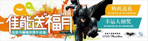 行业资讯 在刚刚落幕的2013年佳能春季新品发布会上,佳能小型数码相机的全新代言人、好莱坞重磅明星“蝙蝠侠”亮相。此次佳能送“福”月也将携手全新代言人“蝙蝠侠”为大家送出精彩好礼。何不趁这个大好时机为自己和家人朋友添置一款数码新宠,为这个春季留下最动人的影像!现在参加佳能送“福”月活动,不仅有多款高性价比的机型供您选择,还有贴心实用的丰厚礼品,更有蝙蝠侠周边好礼等您来拿,让“蝙蝠侠”把“福”气带给您!