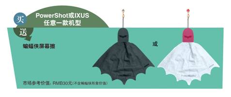 凡在活动期间购买IXUS伊克萨斯系列、PowerShot博秀系列指定机型,均可获得精致便携相机袋,不仅方便相机的携带,也能让您的爱机在外出游玩时得到贴心的保护;还有蝙蝠侠形象的屏幕擦,既实用又有个性。