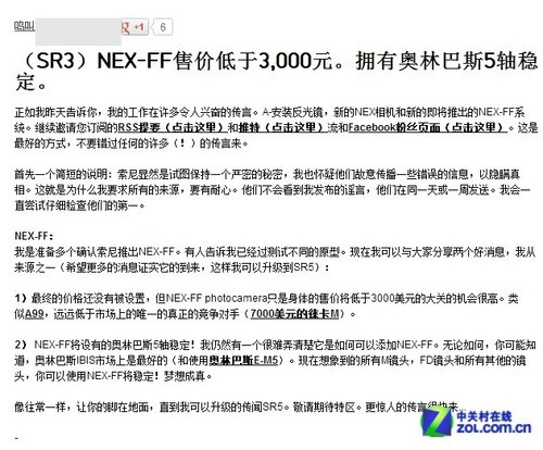 行业资讯关于全画幅NEX的消息最近越来越密集,近日国外网站sonyalpharumors爆料,新的全画幅NEX相机将配有奥林巴斯的5轴防抖技术,并且售价应该与A99相似,不会高于3000美元,远远的低于市场上的唯一的真正的竞争对手(7000美元的徕卡M)。