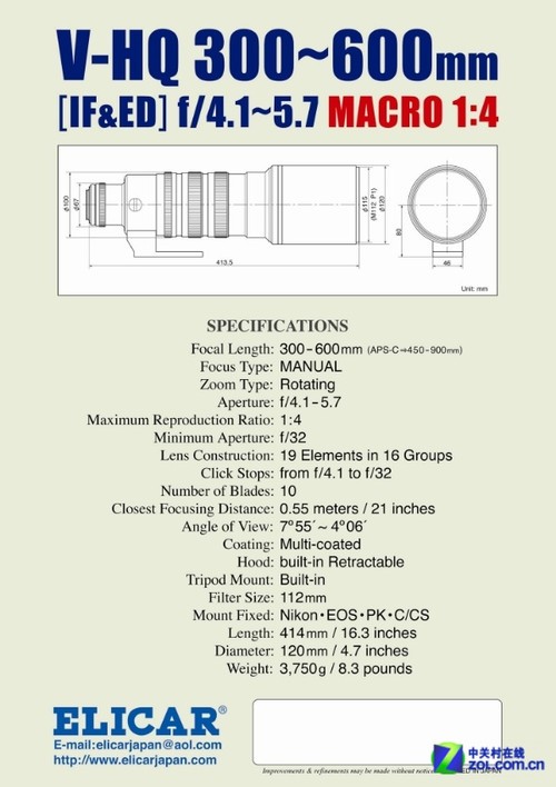 行业资讯Elicar是日本一家非常低调的镜头厂商,主要生产长焦镜头与微距镜头。在去年举办的Photokina大会上,他们曾展出了一款型号为V-HQ 300-600mm f/4.1-5.7 Macro的工程版镜头,最近他们推出了该镜头的最终上市版。