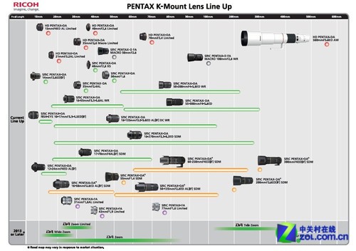 理光对宾得K卡口单反镜头路线图进行了更新,从2013年秋季开始,将推出包括DA 12-28mm、DA 24-38mm Limited,以及DA 120-280mm在内的多款宾得K卡口变焦镜头。宾得最新K卡口镜头路线图: