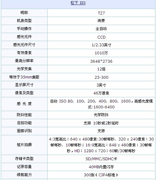 松下ZS3兼顾广角长焦端的成像能力,焦距范围达到了25-300mm,它的背面采用46万像素3英寸的液晶显示屏幕,显示效果出众。同时具备智能拍摄功能让初学者也能运用自如。目前ZS3在市场上拥有极高的关注度,是比较热门的便携长焦相机。