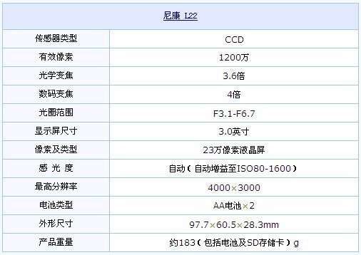 尼康L22使用了一枚1/2.3英寸的CCD感光元器件,1210万有效像素,最大可拍摄4000×3000分辨率的照片,最高感光度可达ISO1600。镜头方面,该机搭载了一枚3.6倍光学变焦的尼克尔镜头,等效焦距为37-134mm。虽然光变倍数并不是很大,不过3.6倍光变属于比较成熟的技术,相信会带来比较稳定的成像,而且也能满足日常的拍摄。在屏幕方面,L22搭载了一块3.0寸、23万像素大屏,从尺寸来说还是得到了一定的进步。