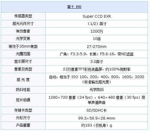 作为广受欢迎的便携长焦富士F75EXR的升级机型,富士F85EXR采用全新设计的1/2英寸1200万像素的超级CCD EXR传感器,并且具备720p高清视频拍摄能力。10倍光学变焦的富士龙镜头焦段为27-270mm,涵盖广角和长焦,配合传感器位移防抖技术,能降低长焦端及慢速快门下抖动产生的影响。前代产品F75就创造了不俗的销售业绩,性能升级的F85EXR在清明节期间受到欢迎也在情理之中。