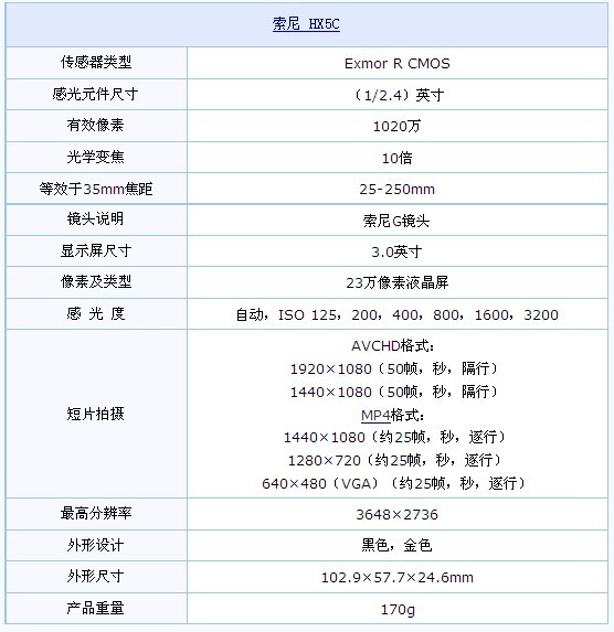 行业资讯便携长焦功能之王,这是包括笔者在内很多人对于索尼HX5的第一印象。先进的1000万像素Exmor R CMOS背照式传感器、独有的Bionz影像处理器以及超广角专业G镜头,赋予了HX5很多令人羡慕的特性。其中不光有先前HX1所具备的高速连拍、全景扫描、手持夜景,索尼还首次让便携长焦相机HX5具备了1080 50i AVCHD格式标准全高清视频拍摄功能。可以说在HX5身上,我们已经明显看出未来DC和DV之间的一种融合。今日笔者在市场上了解到,这款刚刚上市不久的长焦相机,售价有了小幅度调整,最新价格是2440元,附送包、贴膜、4G高速卡、高速读卡器、迷你三脚架、清洁套装。