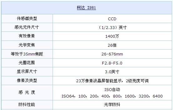 柯达Z981为Z980的升级产品,具备26倍光变的德国施奈德镜头,等效焦距为26-676mm,大变焦镜头的特性适合旅行拍摄,26mm的广角镜头适合拍摄建筑或风景画面。Z981具备1400万像素(Z980只具备1200万像素),支持0.2s的快速拍摄,机背搭载3英寸屏幕,可拍摄720p的高清影像。
