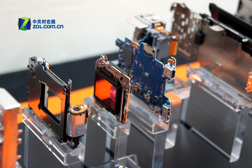 当初手代木先生给我们布置功课的时候,只提出了了两个必须坚持的要求:1.在画质上要和Alpha单反保持一致;2.镜头要和Alpha有互换性;除此之外,随便怎么设计都可以。在很短的设计期内,要对传感器等组件进行重新设计,做到更薄、更小,这是一个相当大的挑战。比如说这个快门组件,它的马达部分和按钮动作部分之间的距离理论上是越近越好,但是为了做到超薄,我们把它分开来做,所以这也是一个新的设计。在马达和机械部件之间,我们插入了传感器,使这些部件都整合在一个组件上。把整个部件摊开设计,来尽量减小厚度,这个也是轻薄化的设计关键之一。