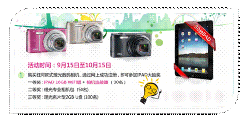 第一重大礼:9月15日起到10月15日期间,凡购买包括CX4在内的任意款理光数码相机,通过网上成功注册,即可参加iPad抽奖活动,30个iPad大奖等你拿哦!