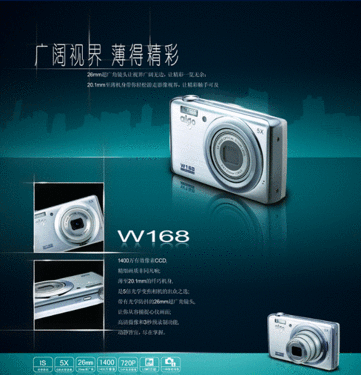 作为爱国者数码相机2011年的开年重头戏,新上市的W168可谓是爱国者数码相机迄今为止配置最高的一款相机,其强悍配置甚至可以打败市场上绝大部分其他品牌相机;而秉承着爱国者一向“质高价优,让利国人”的原则,这款W168定价却远远低于市场其他同等配置的机型!除了超高的性价比,这款机器更加注重相机外型的便携性和功能操作的简易性:超薄设计时尚灵巧,高贵中透露着娇小玲珑的秀气;简单易操作的实用性更是让她拥有了“小个头,大功能”的特质。“浓缩的就是精华”这句话用在爱国者W168身上可谓是一句实实在在的真理,希望爱国者W168的上市能给您兔年的生活增添更多的精彩与乐趣。