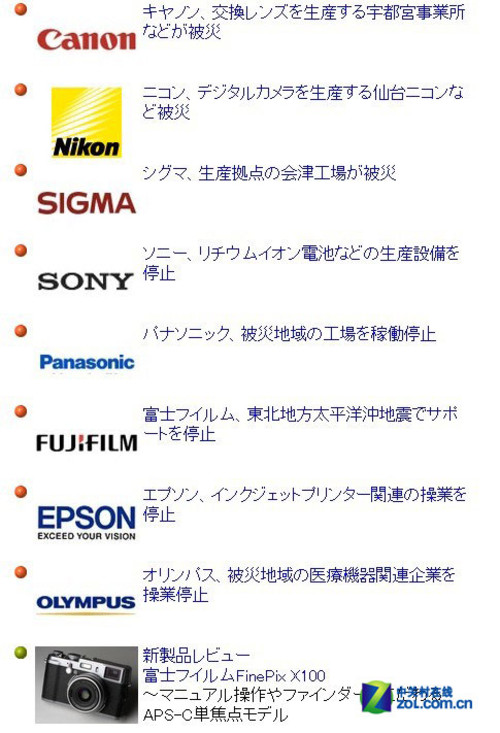 行业资讯由于受到日本东北部3.11大地震的影响,日本地区采取限电管理,多家数码相机厂商已经陷入关闭停产状态。佳能、尼康、索尼、松下、富士、奥林巴斯、适马等相机生产厂家都受到了不同程度的影响,使数码相机的生产以及运输都处于暂停状态。经目前掌握的情况,本文总结了部分相机厂家在此次地震中受到的一些受损情况: