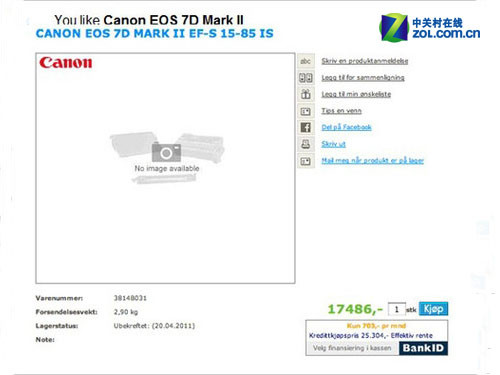 昨天笔者在一家挪威网上商店看到,该商家已经将佳能EOS 7D Mark II添加到产品目录中,经进一步了解,得知预售日期为4月20日,售价为17,486挪威克朗(约合人民币20,698元)。