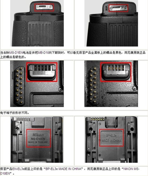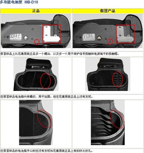 行业资讯2011年6月15日,尼康官方网站针对MB-D10电池匣及多款电池和配件真伪发布了正式声明,并给广大用户提供了可靠的真伪鉴别对照图,详情如下: