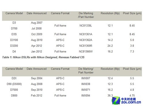 尼康的传感器基本可以分为三个来源,1:尼康自行设计,瑞萨代工生产;2:尼康与Aptina共通设计,Aptina生产;3:索尼半导体先行设计,尼康再修改前部滤镜以及ADC,索尼半导体生产。总的来说来源复杂可以保证技术上了解的尽可能全面,在这里笔者也期待Chipworks能给我们爆出更多的猛料。