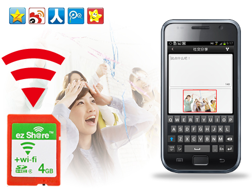 其次,”ez Share“安卓客户端让您体验分享发布的即时性和快捷性。ez Share易享派 Wi-Fi SD卡能够自建Wi-Fi局域网络,无论周围是否覆盖有无线信号,都能够利用手头的无线终端设备进行浏览。不仅可以通过浏览器登入卡片相册进行查看,还可手动选择自己需要的照片进行下载,也可以让所有拍摄的照片自动推送到手机之中。而其中特别新增了”一键分享“功能,只要您将自己的新浪微博、腾讯微博、人人网等账号绑定其中,软件会自动的保存登录名与密码,只需输入一次即可。点击照片上的”社交分享“按键,便可进入微博编辑窗口,点击发送,便可列入发送队列,当切换回外网时,便能自动发布。旅游途中,逛街之时,想要将途中美景,完美自拍,宴会美照发布至社交网络,与好友一起观看,即刻便可一步实现。